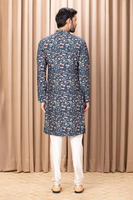 Navy blue kurta featuring digital printed hand-painted floral motifs. Paired with an ivory churidar for a complete look.