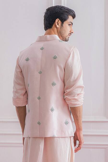 Powder pink Nehru jacket with geometric intricate hand embroidery & mandarin collar.