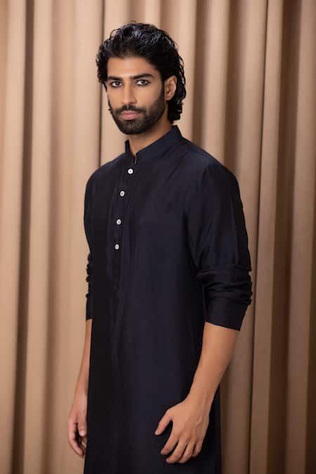 Navy blue kurta featuring a mandarin collar and straight long sleeves. Paired with an ivory churidar for a complete look.