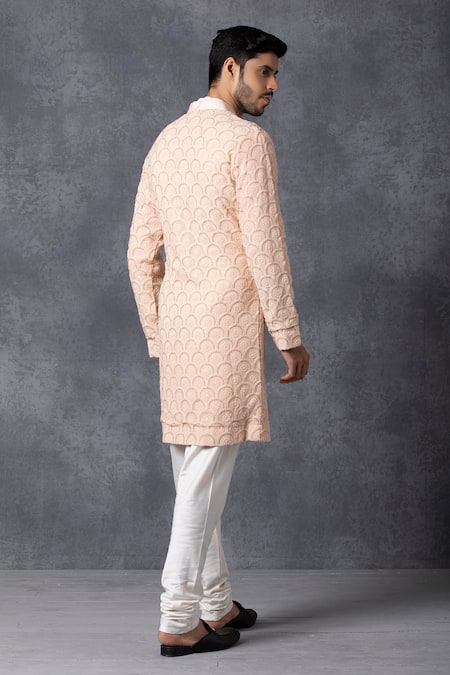 Peach sherwani with embroidered floral motifs. Comes with churidar.