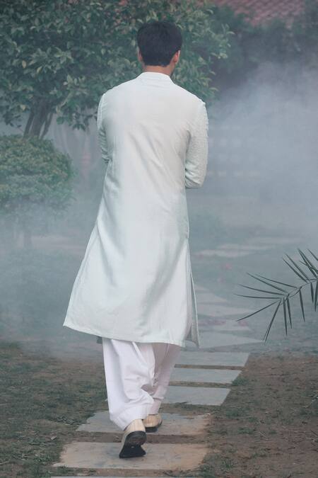 Powder blue kurta featuring thread and sequin embroidery with a band collar. Paired with an ivory salwar for a complete look.