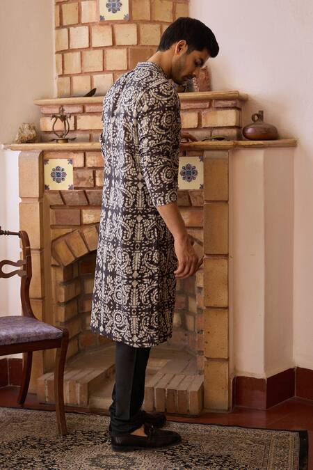 Black kurta featuring Mughal inspired inlay print with a band collar and long sleeves. Paired with a matching churidar for a complete look.