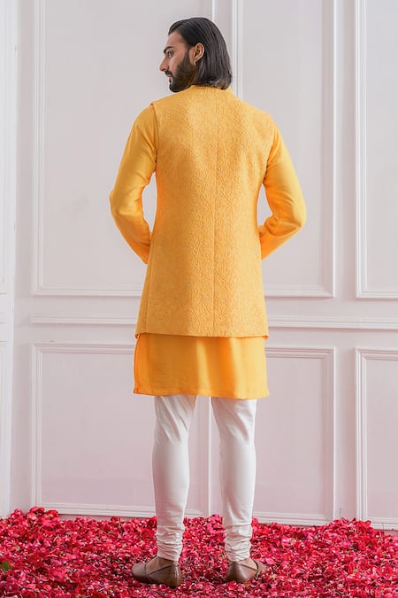Mustard lucknowi longline bundi with thread & zari embroidery. Comes with kurta & ivory churidar.