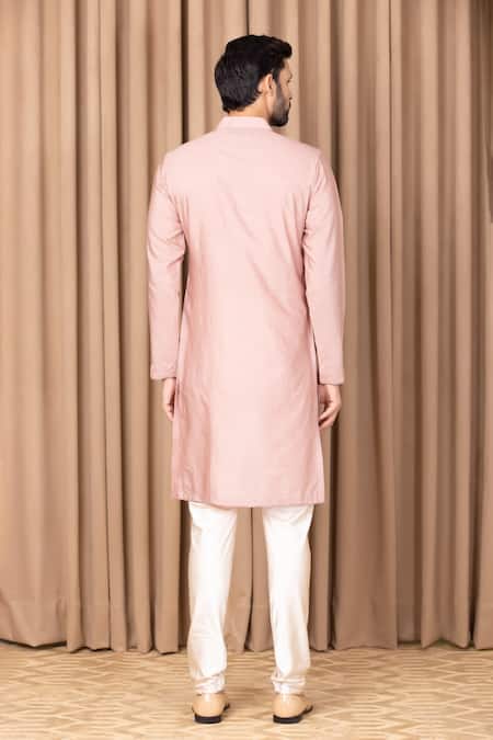 Pink kurta featuring leaf pattern embroidery on the front and sleeves hem. Paired with an ivory churidar.