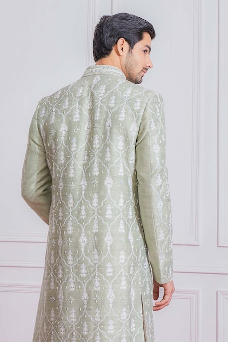 Mint green sherwani with floral embroidery & full sleeves. Paired with cotton silk kurta & churidar.