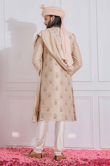 Beige gold sherwani with mandarin collar, floral embroidered motifs & full sleeves.