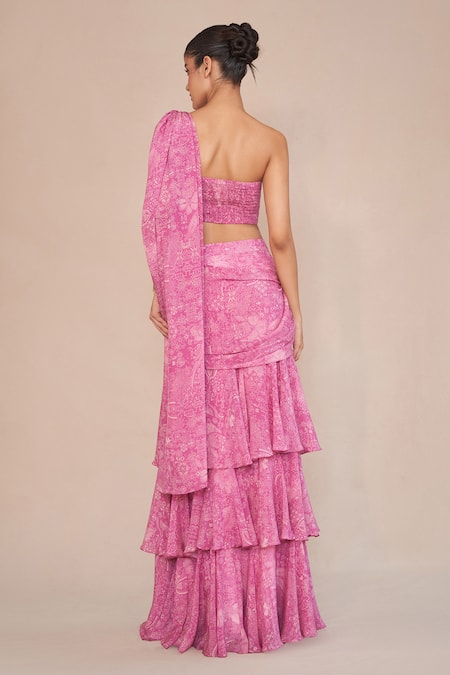 Pink pre-draped saree featuring tiered ruffles with floral and geometric print. Paired with a coordinating ruched and pintucked blouse.