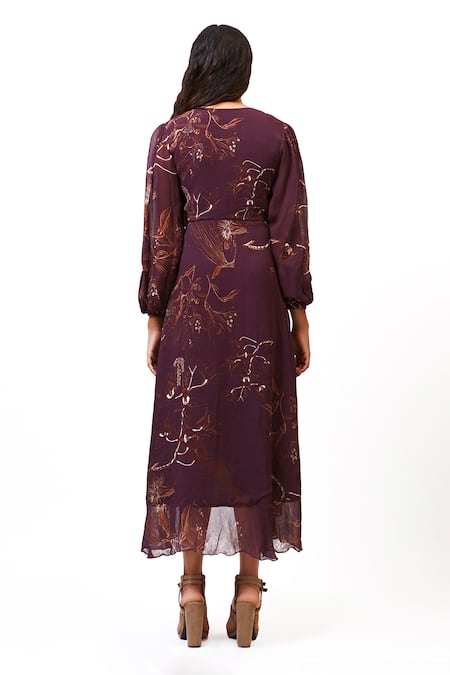 Dark plum wrap dress with all-over floral print, V-neckline, ruffle detailing and high low hem.