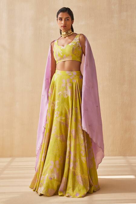 Green lehenga featuring all-over floral patterns, paired with a matching blouse and a lavender organza dupatta. The scalloped hem dupatta adds a delicate touch to the ensemble.