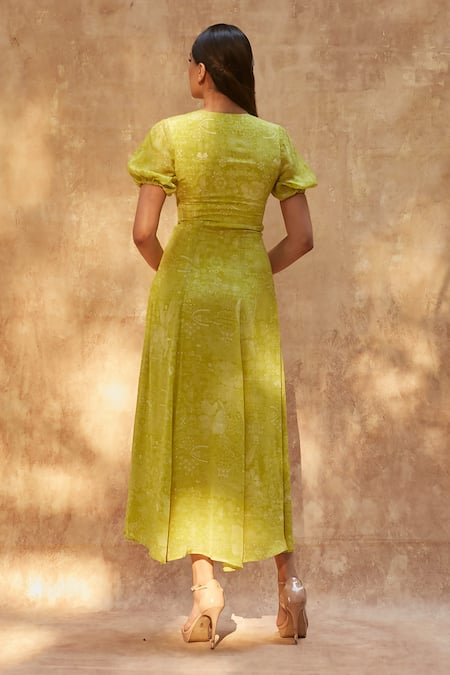 Green midi dress featuring a plunge V neckline and puffed sleeves