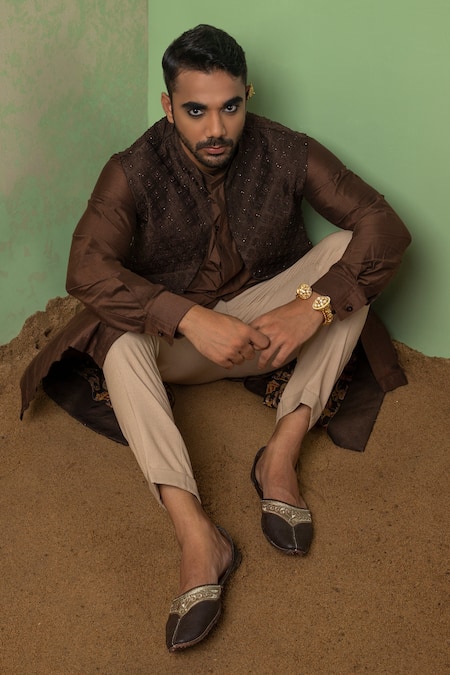 Brown Bamboo Silk Thread And Cutdana Avastra Embroidered Longline Bundi Kurta Set