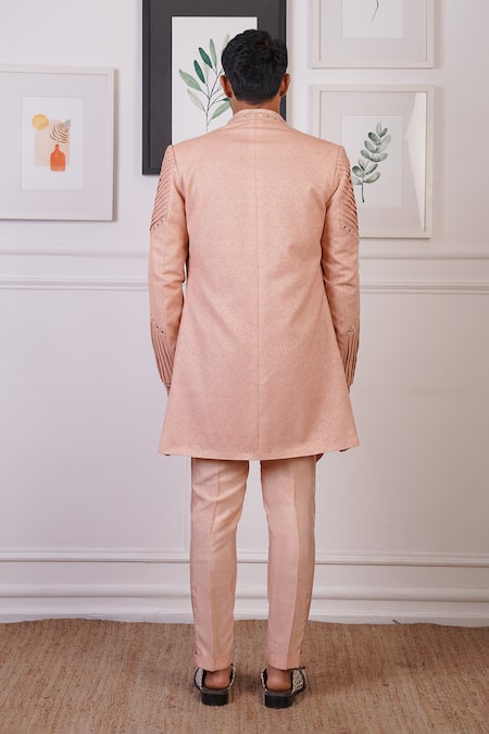 Peach asymmetric hem sherwani featuring intricate mirror embroidery. Paired with a matching inner mesh shirt and pant.