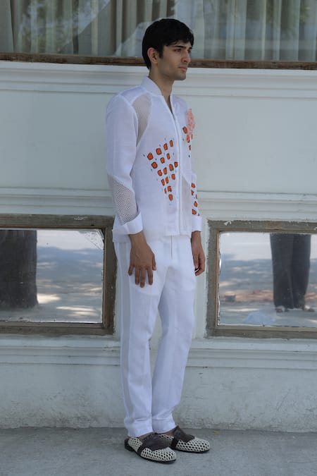 Buy_Ankur J_White Cotton Embroidery Designer Crochet Bomber Shirt _at_Aza_Fashions