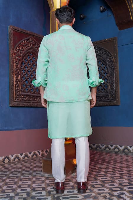 Green kurta set featuring a floral printed asymmetric overlay jacket. Paired with a matching printed sheer kurta and pant pyjama.