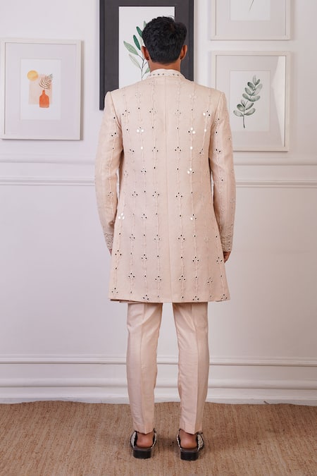 Peach sherwani featuring mirror embroidery in a linear, mandala butti pattern. Paired with a textured kurta and pant.