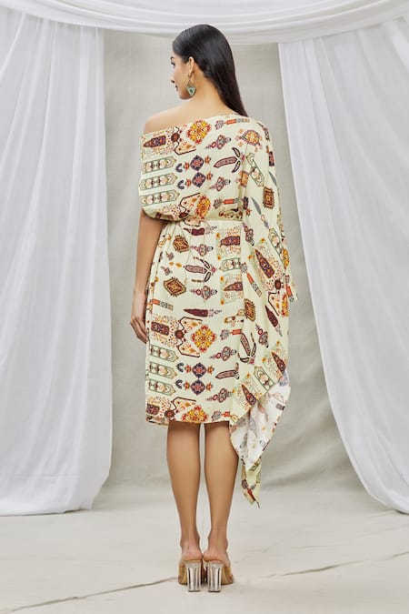 Multi Color Cotton Silk Bead Work, Sequins One Shoulder Draped Kaftan