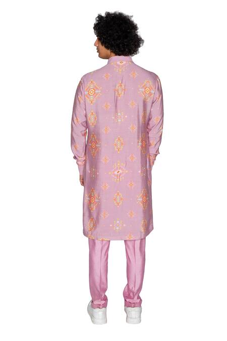 Purple kurta in cotton silk base with geometric printed motifs & ribbed collar & sleeves hem.