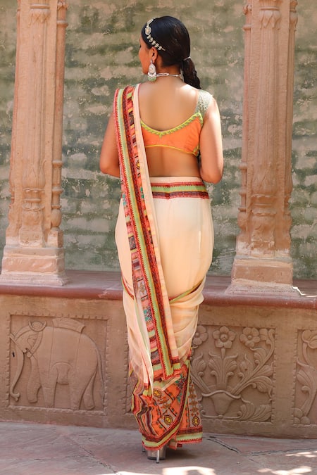 Peach pre-draped saree featuring architectural prints and a cutwork border. Paired with a zardozi embroidered sleeveless blouse with a V neckline.