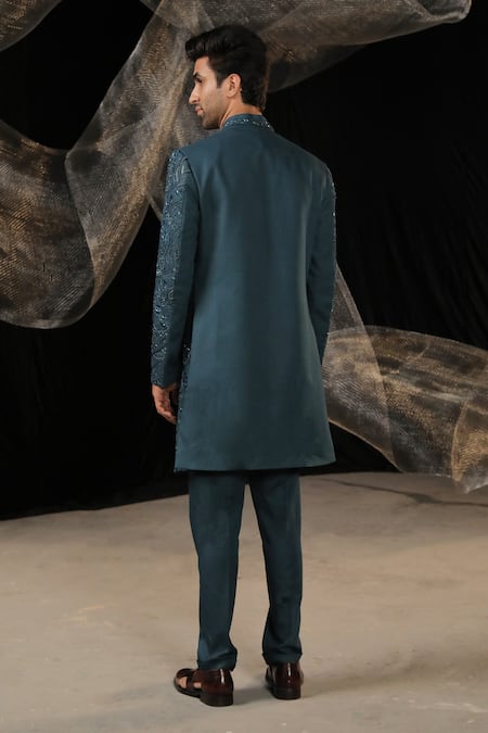 Shop_Ankur J_Blue Moss Crepe Embroidery Resham Work Sherwani With Pant _Online_at_Aza_Fashions