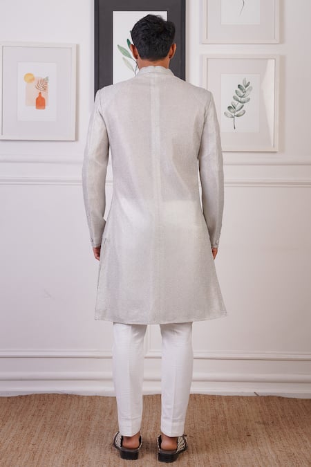 Grey long sherwani featuring tonal floral embroidery and zardozi highlights. Paired with matching pants for a complete look.