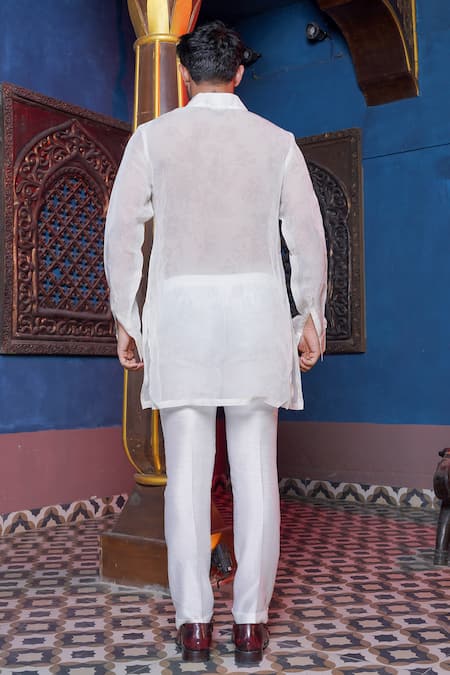 White sheer kurta featuring a tonal floral print and a V-neck. Paired with matching pant pyjama for a coordinated look.