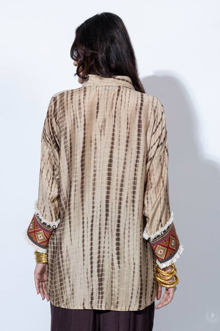 Buy_Anmol Kakad_Beige Cotton, Silk Tassels Collared Tie-dye Embroidered Cuff Shirt_Online_at_Aza_Fashions