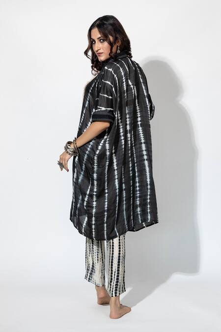 Black and white tie-dye kaftan featuring mirror tassels and cross stitch embroidery. Paired with matching tie-dye pant for a coordinated look.