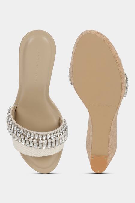 Ivory wedges featuring intricate stone work on a jute and suede base