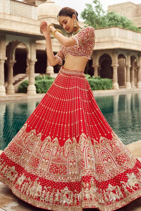 Red flared cancan lehenga featuring baraat embroidery with cutdana, pearls, tikki, and zardozi. Paired with a sweetheart neckline padded blouse and two embroidered dupattas.