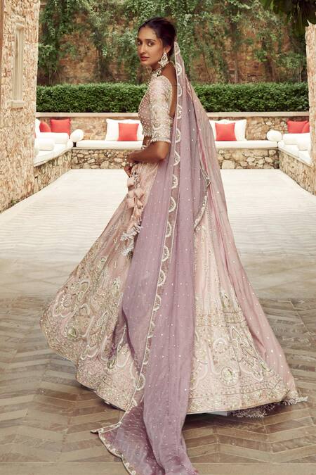 Pastel pink lehenga featuring paisley bloom embroidery with cutdana, pearls, tikki, and zardozi. Accompanied by a padded blouse with sweetheart neckline and two embroidered dupattas.