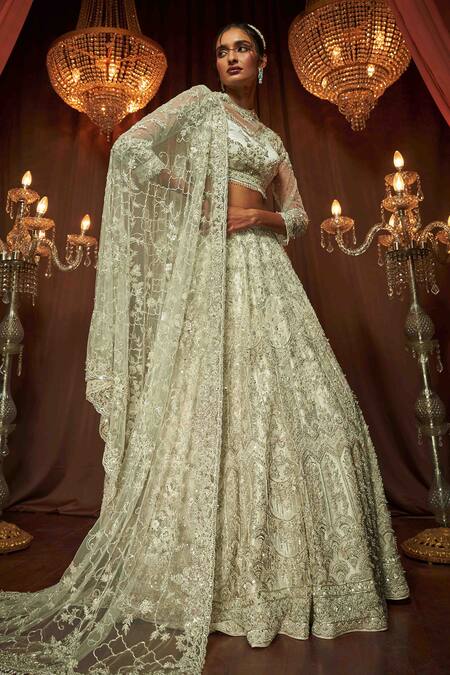 Ivory lehenga featuring a floral jaal pattern with tonal pearl, sequin & cut dana embroidery. Paired with an illusion round neck padded blouse and embroidered dupatta with bead tasselled hem.