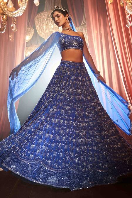 Royal blue lehenga featuring an all-over floral pattern with tonal cut dana, sequin, and pearl embroidery. Paired with a one-shoulder neck padded blouse and a hand-embroidered dupatta with tasselled edges.