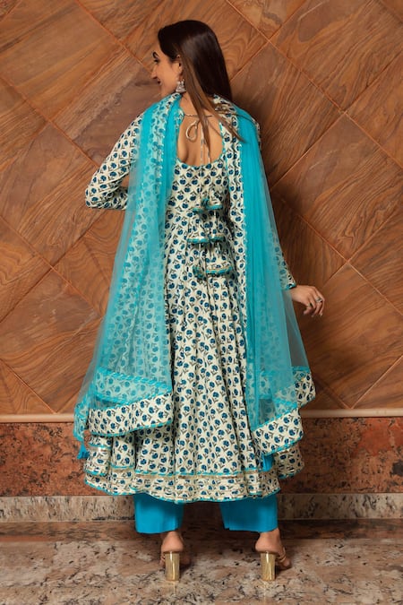 Blue flared anarkali kurta made in cotton base features all over calico floral print. Paired with co-ordinating pant and net dupatta.
