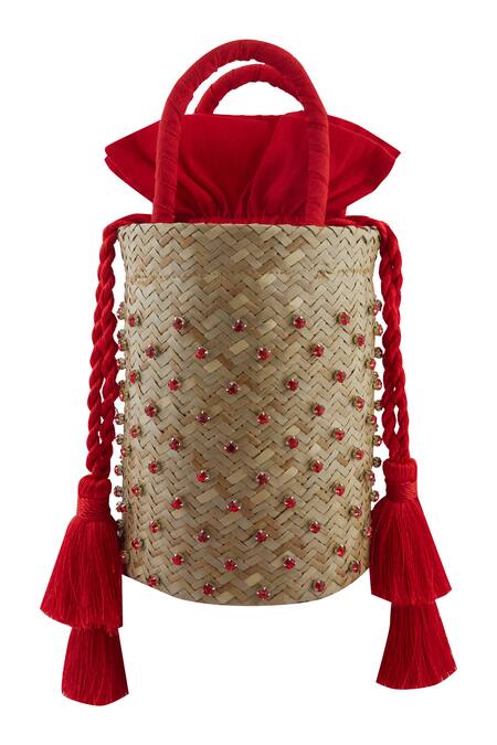 Red cylindrical shaped basket weave bucket bag featuring diamonte embellishments and tassel detailing
