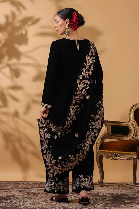 Black velvet kurta featuring intricate embroidery and a round neckline. Paired with matching pant and dupatta adorned with floral designs.