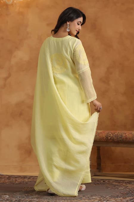 Lemon yellow kurta made from Chanderi fabric featuring a V-neck and intricate embroidery. Paired with matching pants and a Chanderi dupatta, both lined with mul cotton.