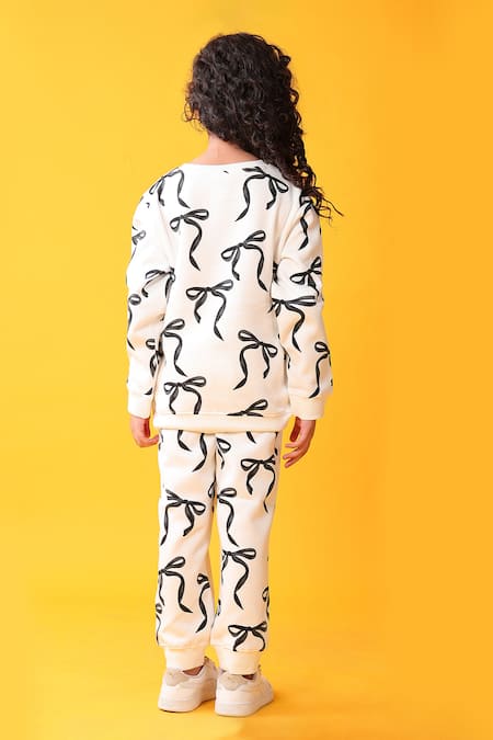 White fleece sweatshirt featuring a bow pattern. Paired with matching joggers for a complete look.