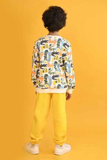 White fleece sweatshirt featuring an all-over crocodile print. Paired with yellow joggers for a complete look.