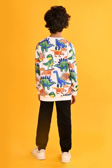 White fleece sweatshirt featuring an all-over dinosaur print. Paired with solid black joggers for a complete look.