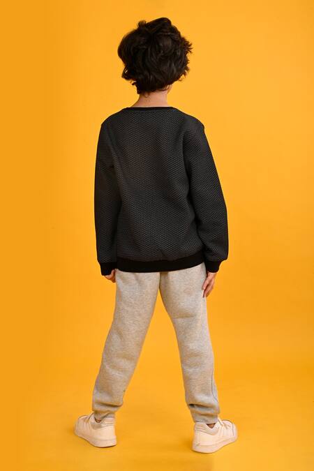 Black fleece sweatshirt featuring an all-over drone print. Paired with solid grey joggers for a complete look.