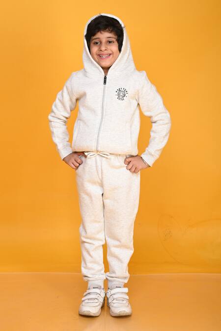 Cream Cotton Embroidery Tiger Motif Hoodie And Jogger Set