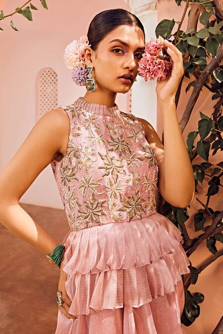 Mauve pink kota padded peplum gown featuring an embroidered yoke and asymmetric hem