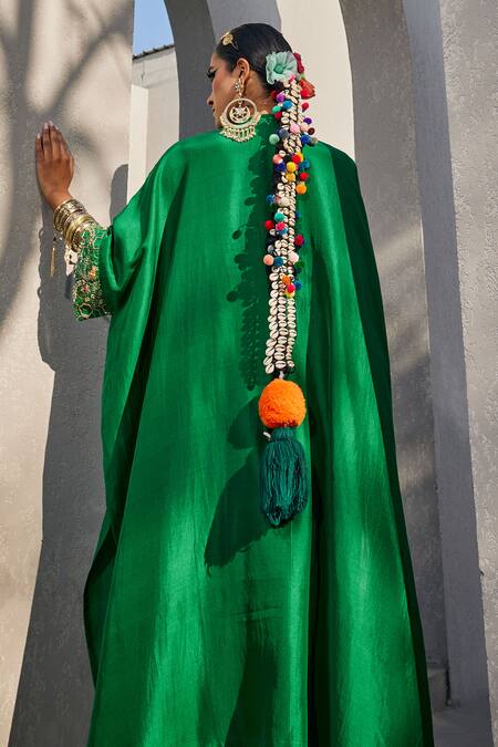 Emerald green kaftan featuring intricate embroidery and a relaxed fit. Paired with coordinating silk pants with a drawstring closure.