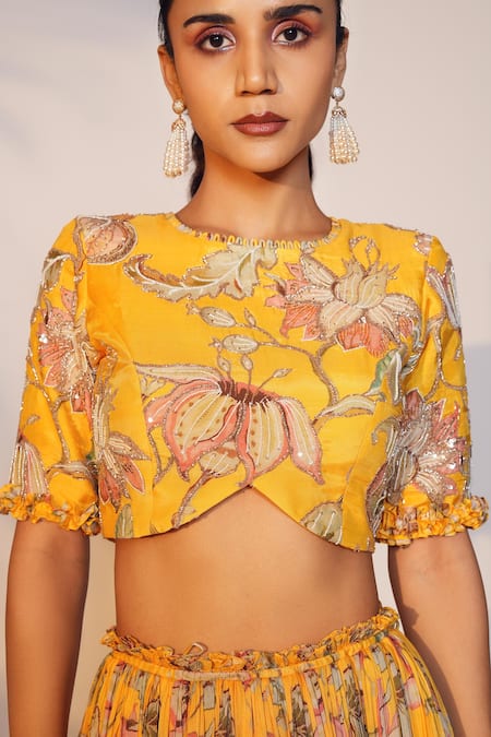 Mustard yellow muslin silk lehenga featuring floral hand embroidery and an attached cancan. Paired with a padded blouse adorned with zardosi and pearls embellishments.