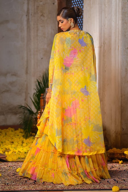 Yellow lehenga featuring frill tiered design and floral print. Paired with a padded blouse adorned with pearl, zari, cutdana and tassel embroidery, along with an organza cape showcasing intricate embroidery.
