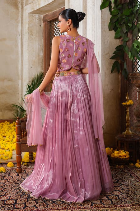 Purple lehenga featuring micro pleated highlights and floral embroidered waistband. Paired with a sleeveless padded blouse adorned with floral applique, cutdana, sequin, and pearl embellishments, along with a soft net dupatta.