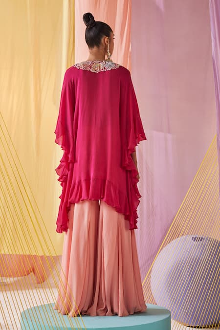 Hot pink kaftan tunic featuring batwing sleeves, ruffled ends, and a hand embroidered neckline adorned with colorful glass beads and rain-drop pearls. Paired with a peach sharara pant with godet kalis detailing.