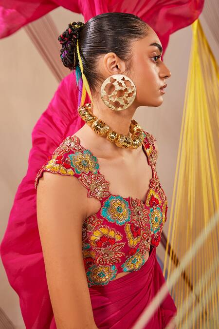 Rani pink pre-draped ruffle saree made of chinon chiffon with an elasticated waistband. Paired with a raw silk padded blouse featuring resham and zardosi hand embroidery.
