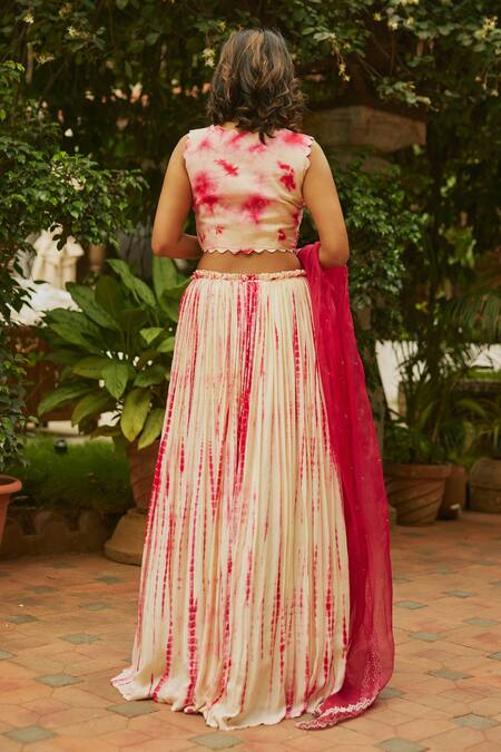 Pink & ivory muslin silk pleated tie-dye lehenga with attached can-can & ruffle waistband. Paired with tie-dye V neck padded crop top with thread, cut dana, sequin, gota, pearl work & pink organza dupatta.