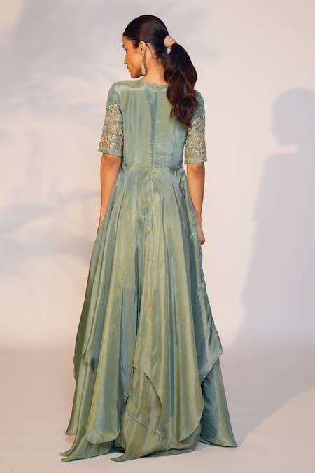 Green Tissue Sequins, Beads Round Neck Yoke Embroidered Gown